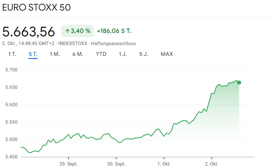 Bereits am Vormittag waren starke Kursbewegungen zu beobachten. Der EuroStoxx50 legte im frühen Handel um rund ein Prozent zu und erreichte den neuen Spitzenwert von 5.643,85 Punkten. Auch der Dax befand sich auf Rekordkurs und gewann zeitweise 0,9 Prozent auf 24.338 Zähler. Zum Vergleich: Das bisherige Allzeithoch liegt nur unwesentlich höher bei 24.631 Punkten.
