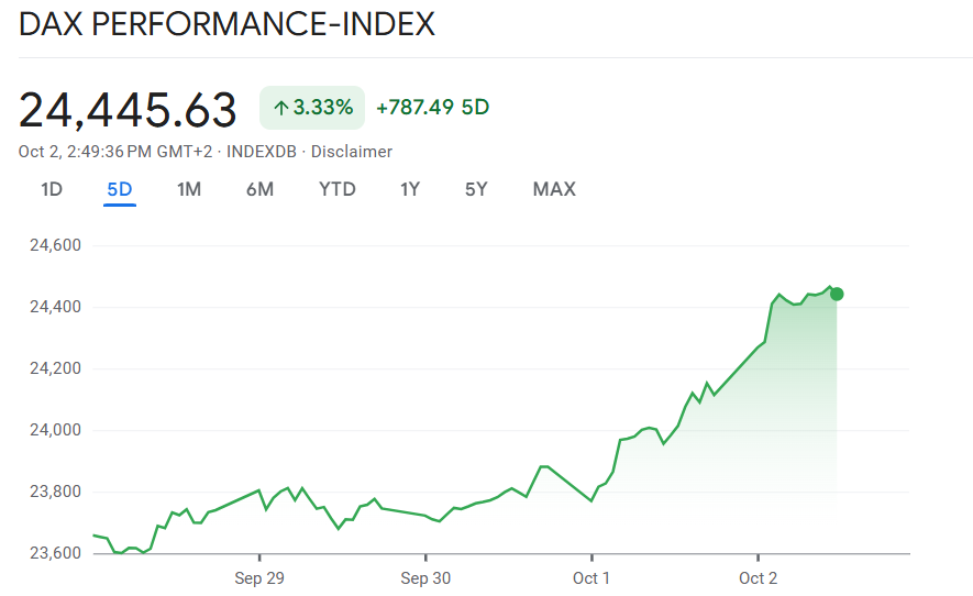 Die europäischen Aktienmärkte haben am Donnerstagmittag kräftig zugelegt. Der Dax kletterte um 1,3 Prozent auf 24.423 Punkte, während der EuroStoxx50 um ebenfalls 1,3 Prozent auf 5.655 Zähler stieg. Bereits zuvor hatte der europäische Leitindex mit 5.661 Punkten ein frisches Rekordhoch erzielt.