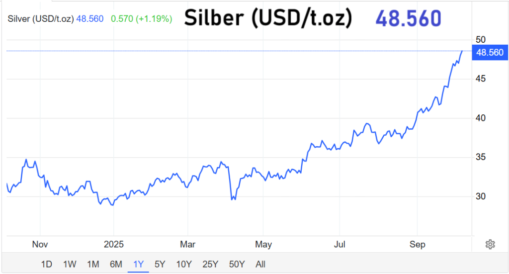 Analysten sprechen von einem „anhaltenden Angebotsdefizit“, das die Preise weiter antreiben dürfte. Der Markt reagiert sensibel auf Engpässe bei Fördermengen und steigende Nachfrage aus Asien. Fachleute erwarten, dass der Preis in Kürze die Marke von 50 US-Dollar je Unze erreichen könnte – ein Niveau, das zuletzt vor über einem Jahrzehnt denkbar war.