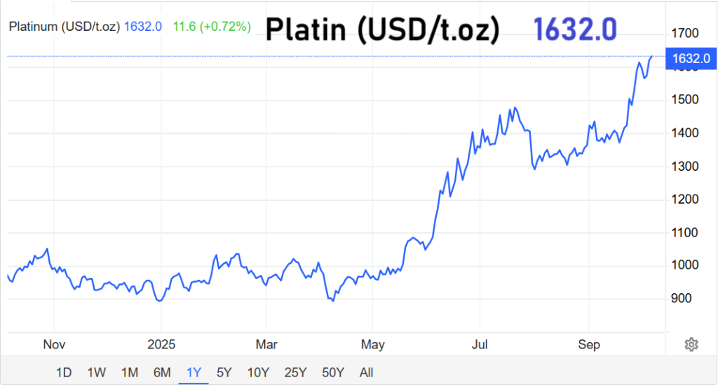 Auch Platin feiert ein starkes Comeback. Nach Jahren der Stagnation stieg der Kurs zuletzt auf 1.632 US-Dollar je Unze – den höchsten Stand seit 2013. Grund ist ein weltweites Angebotsdefizit, das durch Produktionsprobleme in Südafrika verschärft wird.