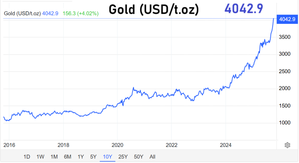 Gold dient in diesem Umfeld als Wertspeicher und Inflationsschutz. Schon in den vergangenen Jahren war die Tendenz klar: Immer dann, wenn die Unsicherheit zunimmt, steigt das Edelmetall im Kurs. Der aktuelle Sprung über die 4.000-Dollar-Marke gilt als Signal, dass Anleger dem Dollar zunehmend misstrauen und sich verstärkt in physische Werte zurückziehen.